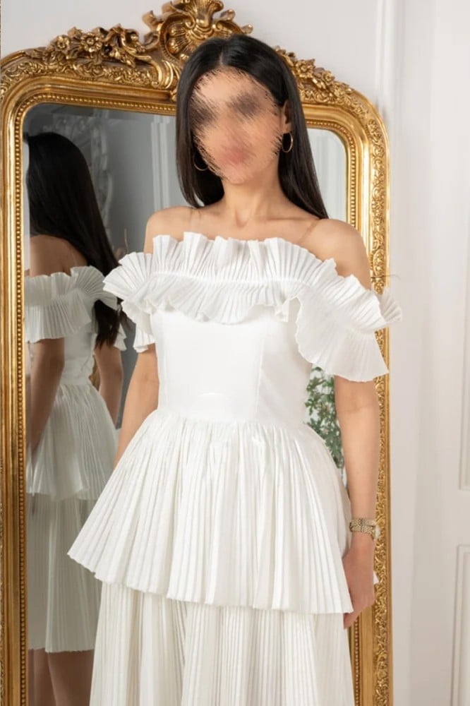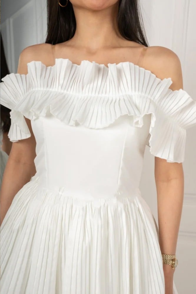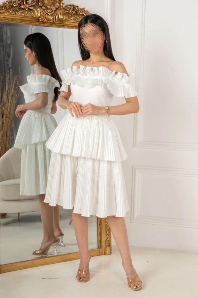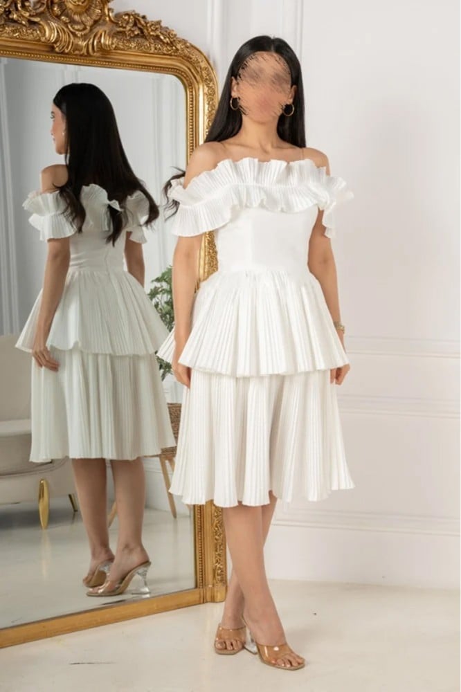 يأتي بلون أبيض ناعم يضفي لمسة من النقاء والجمال. الفستان يتميز بتصميم أوف شولدر يجعلك تبدين أنيقة وجذابة. الفستان مزود بأكمام نص كم تضفي لمسة من الأناقة والرقة. يبلغ طول الفستان حوالي 110 سم، مما يجعله مناسبًا للإطلالات المتوسطة الطول. مناسب للحفلات والمناسبات الخاصة، ستشعرين بالثقة والسحر مع فستان ميدي أوف شولدر طبقات.