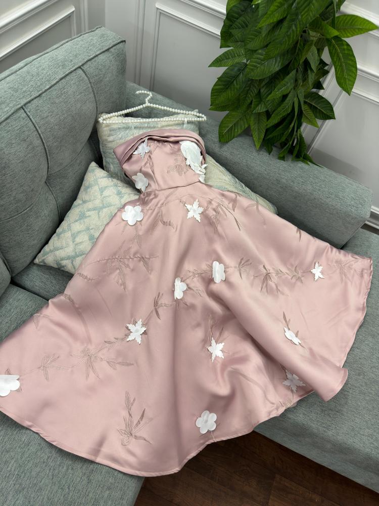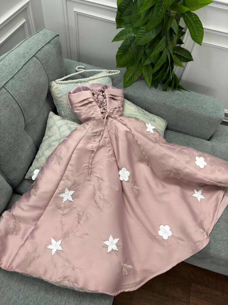 مصنوع من قماش الميكادو الفاخر، يوفر هذا الفستان مظهرًا راقيًا وجميلًا. يتميز هذا الفستان بتصميم ملفت و أنيق على القماش، مما يضفي لمسة طبيعية وأنثوية على الفستان. يأتي بقصة توب على الصدر لإبراز جمال العنق والكتفين. يتميز الفستان أيضًا بعدم وجود أكمام، مما يجعله مناسبًا للأجواء الدافئة والأحداث الصيفية.