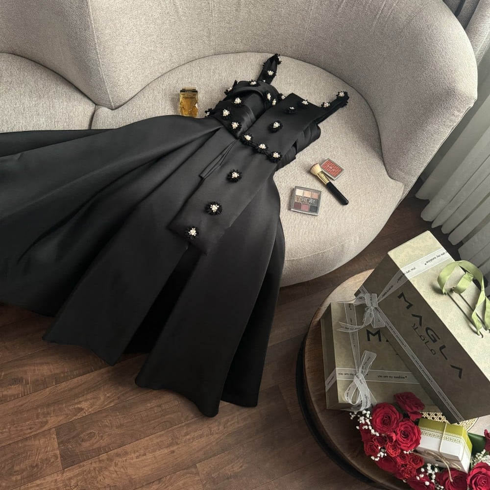 يأتي هذا الفستان باللون الأسود الأنيق، مما يضفي عليه لمسة من الأناقة والجاذبية. تتميز القصة بكسرات جميلة، مما يضفي حجمًا وحركة على الفستان. يأتي الفستان بصدر مربع مفتوح يبرز جمال الجزء العلوي من الجسم. الأكمام غير موجودة، مما يعطي الفستان مظهرًا أنيقًا وعصريًا. يبلغ طول الفستان 125 سم، مما يجعله مناسبًا لمعظم الأشخاص.