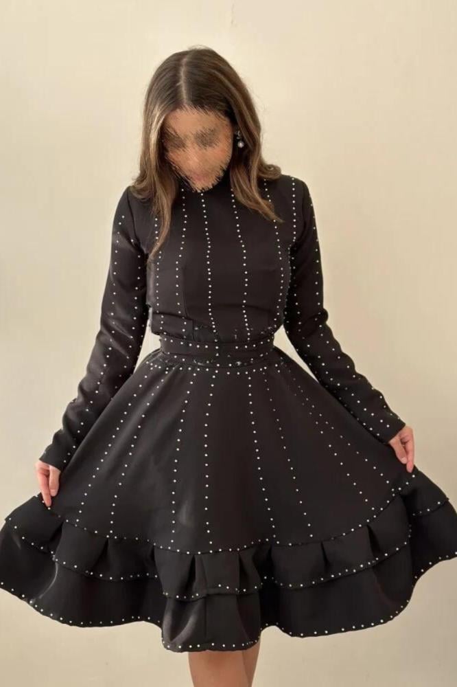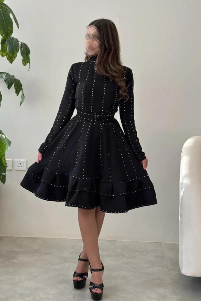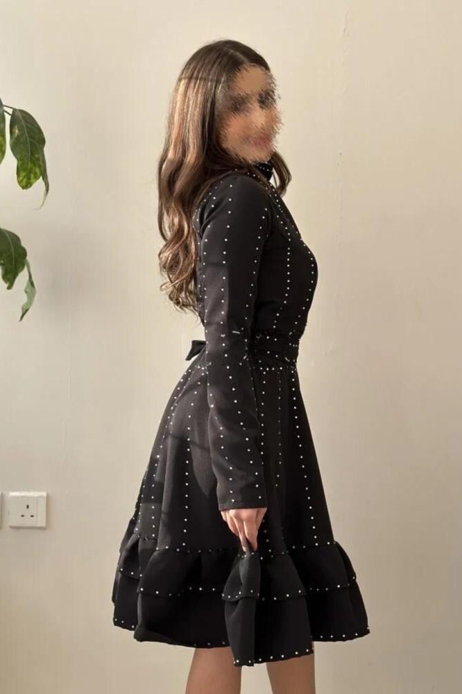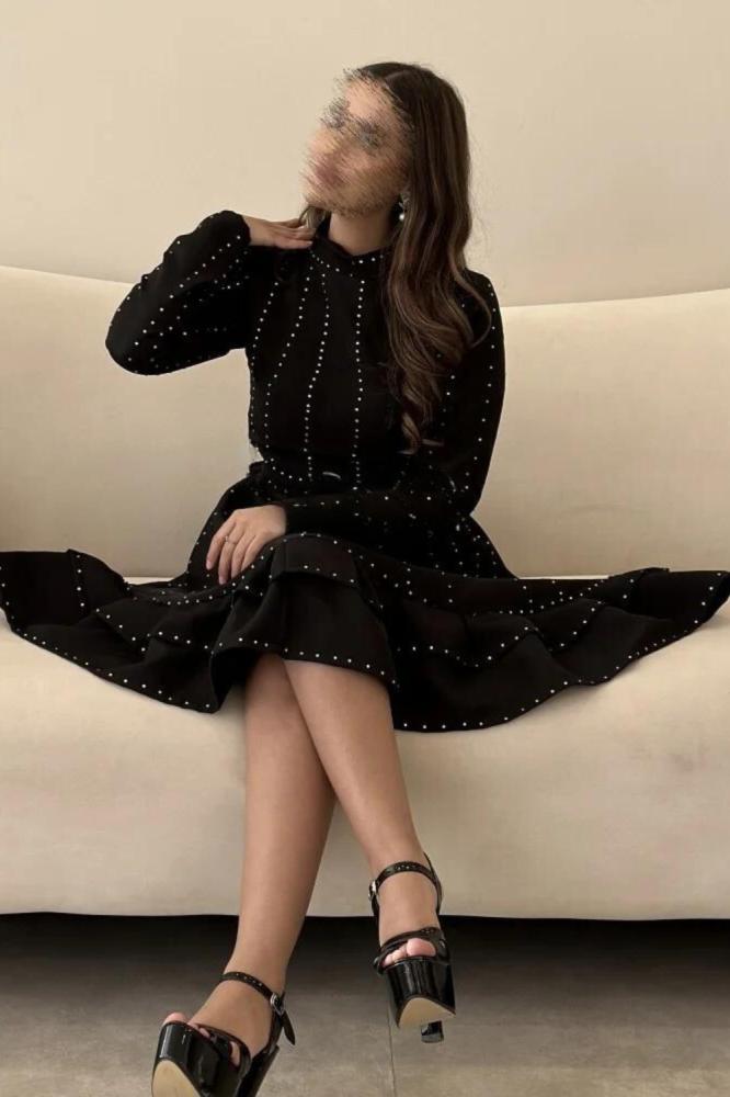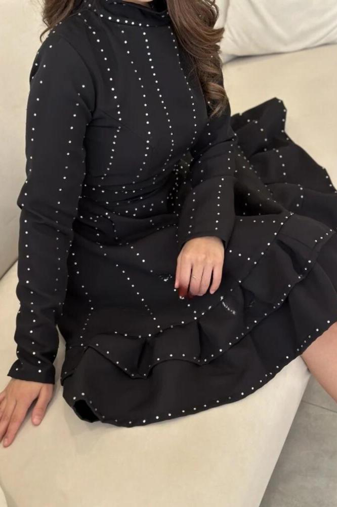 يأتي الفستان بلون أسود أنيق وجذاب، مما يجعله قطعة أساسية في خزانة الملابس. يتميز الفستان بتطريز فصوص راقي على القماش التفته المطرز، مما يضفي لمسة من الفخامة والأناقة على الفستان. يأتي الفستان بقبة عالية وأكمام طويلة، مما يضفي لمسة من الأناقة والتميز.