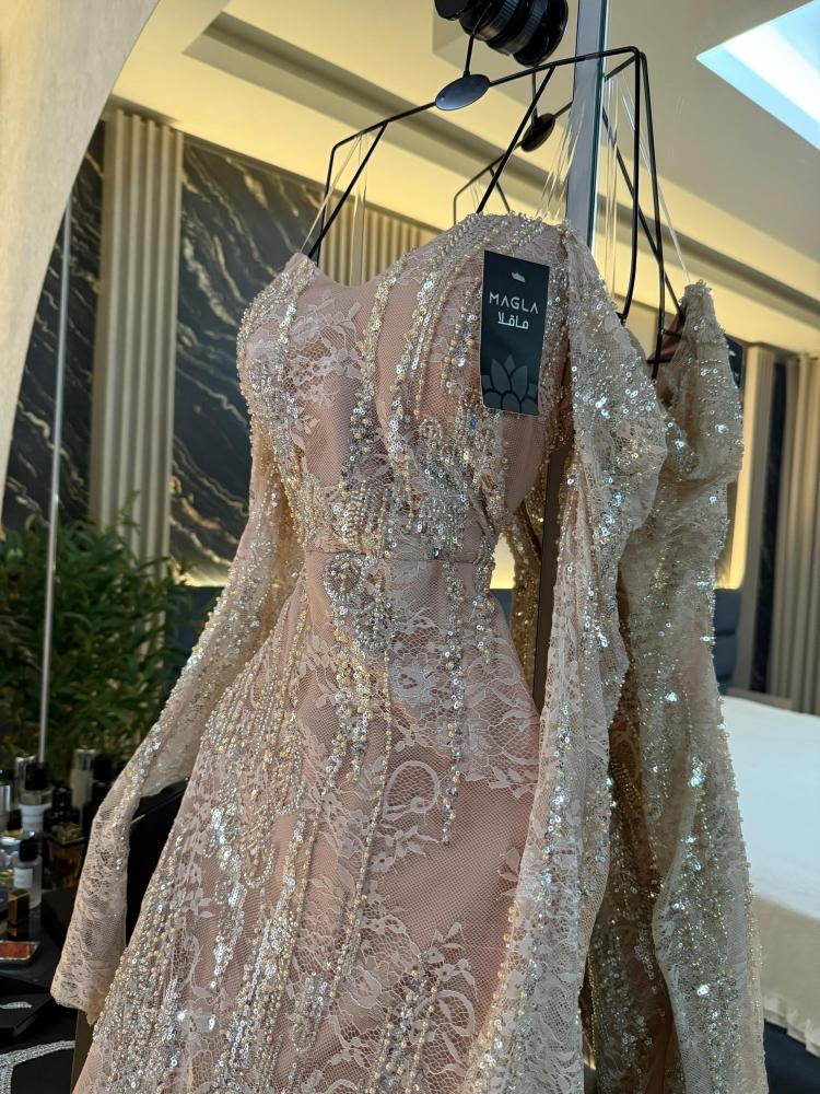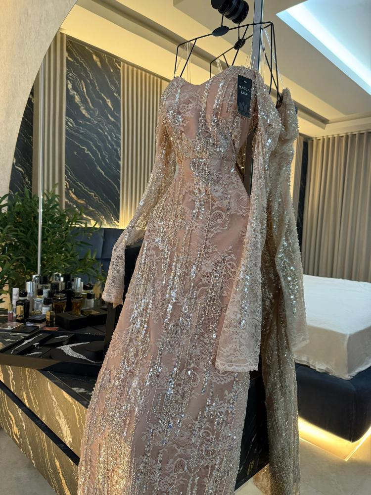 تألقي بإطلالة راقية مع هذا الفستان المصمم من دانتيل فاخر بتطريز خرز وشك يدوي متقن.