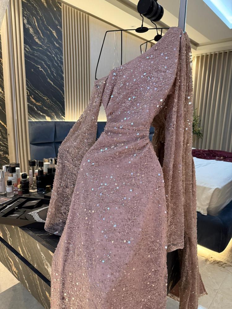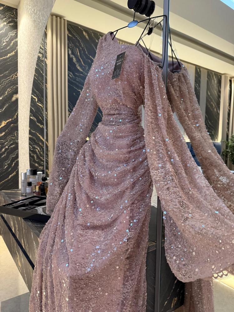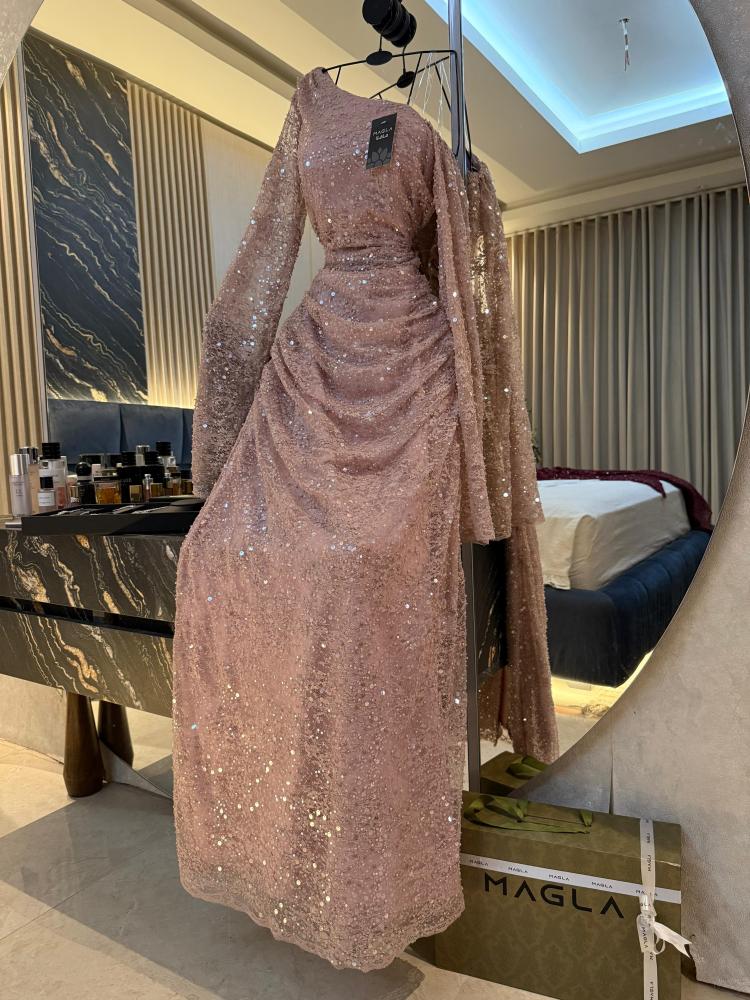 الأكمام الطويلة تضيف لمسة كلاسيكية، والطول ١٥٨ سم يمنح الفستان انسيابية جذابة.
