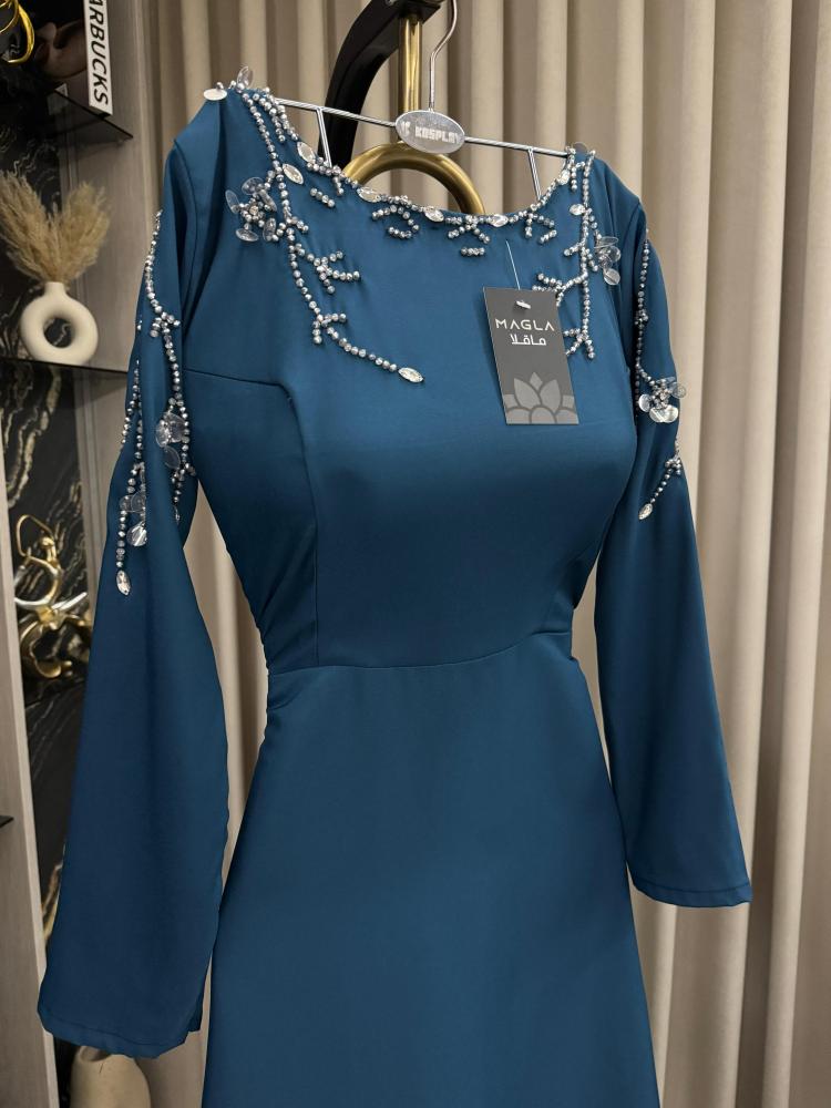 احصلي على فستان نوران بتصميم كلاسيك بلون بترولي يجعل الانظار عليك طوال السهره . يتميز هذا الفستان بقصة كلوش تضفي لمسة من الأنوثة والجاذبية. مصنوع من قماش باربي بتطريز شك يدوي يمنحه مظهرا جذابا وملفت