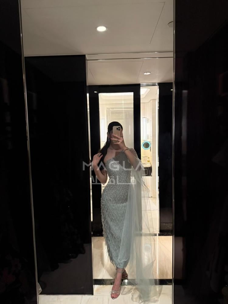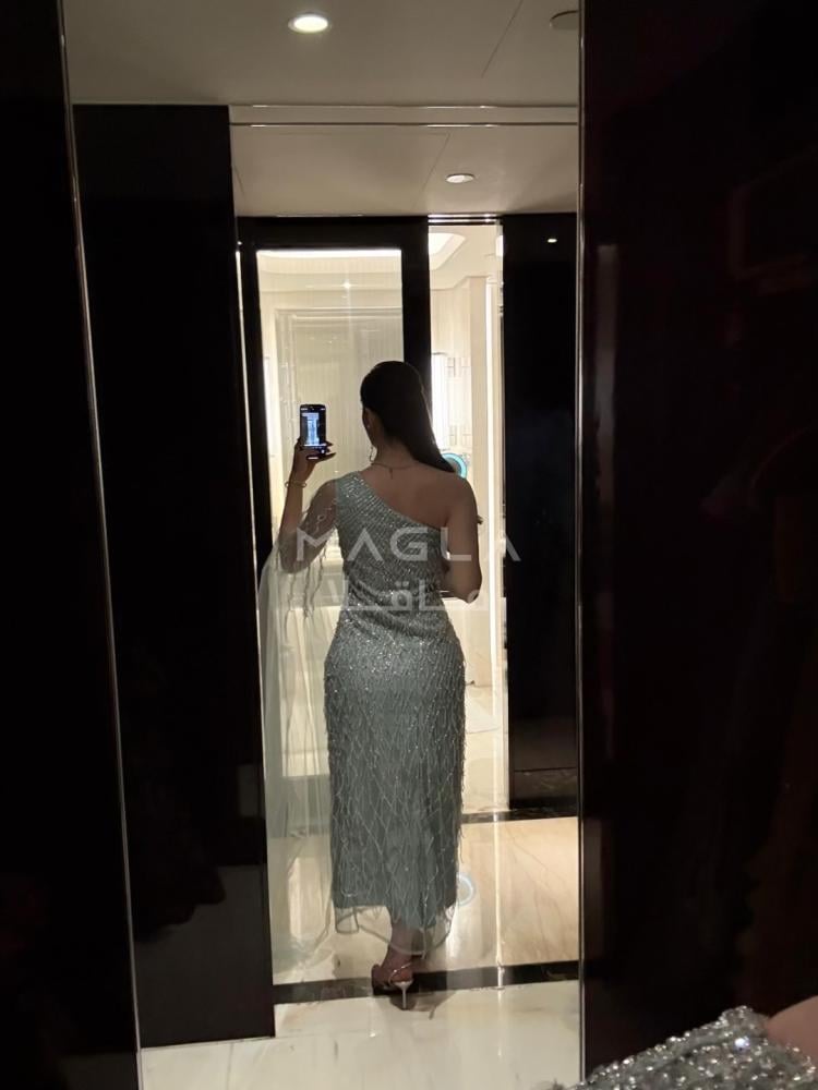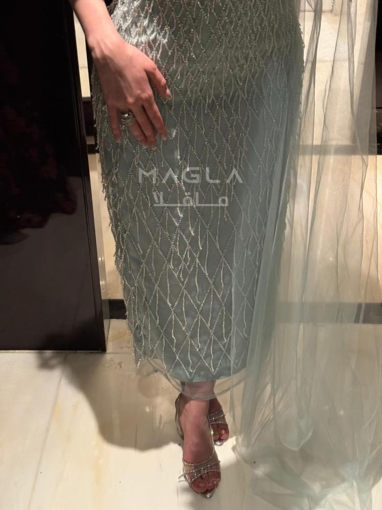 بلون تيفاني فاتح عصري وناعم، بطول ١٥٥ سم مناسب للسهرات والمناسبات الخاصة.