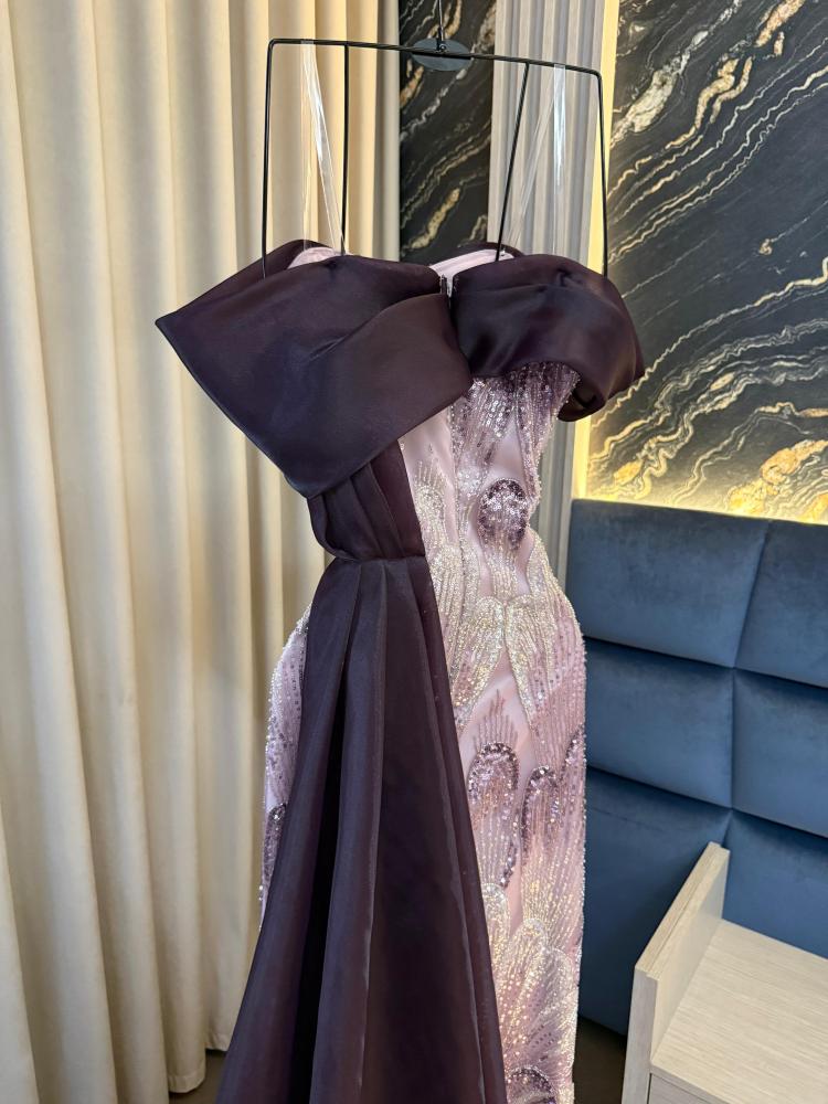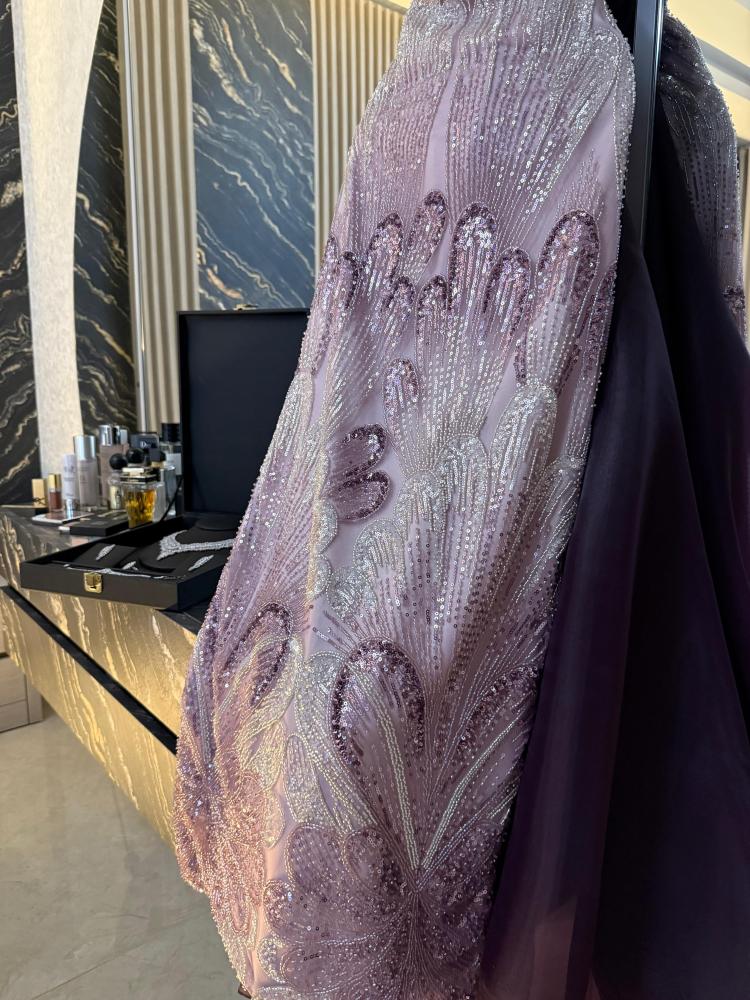 القماش :تل سهره بتطريز خرز شك وبطانه تفته ناعم مع أوف شولدر وذيل جازار